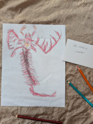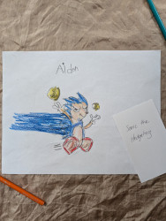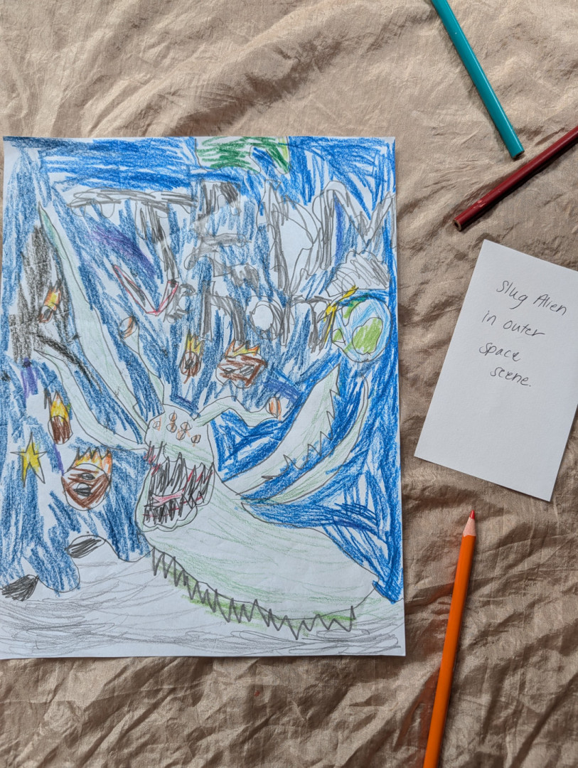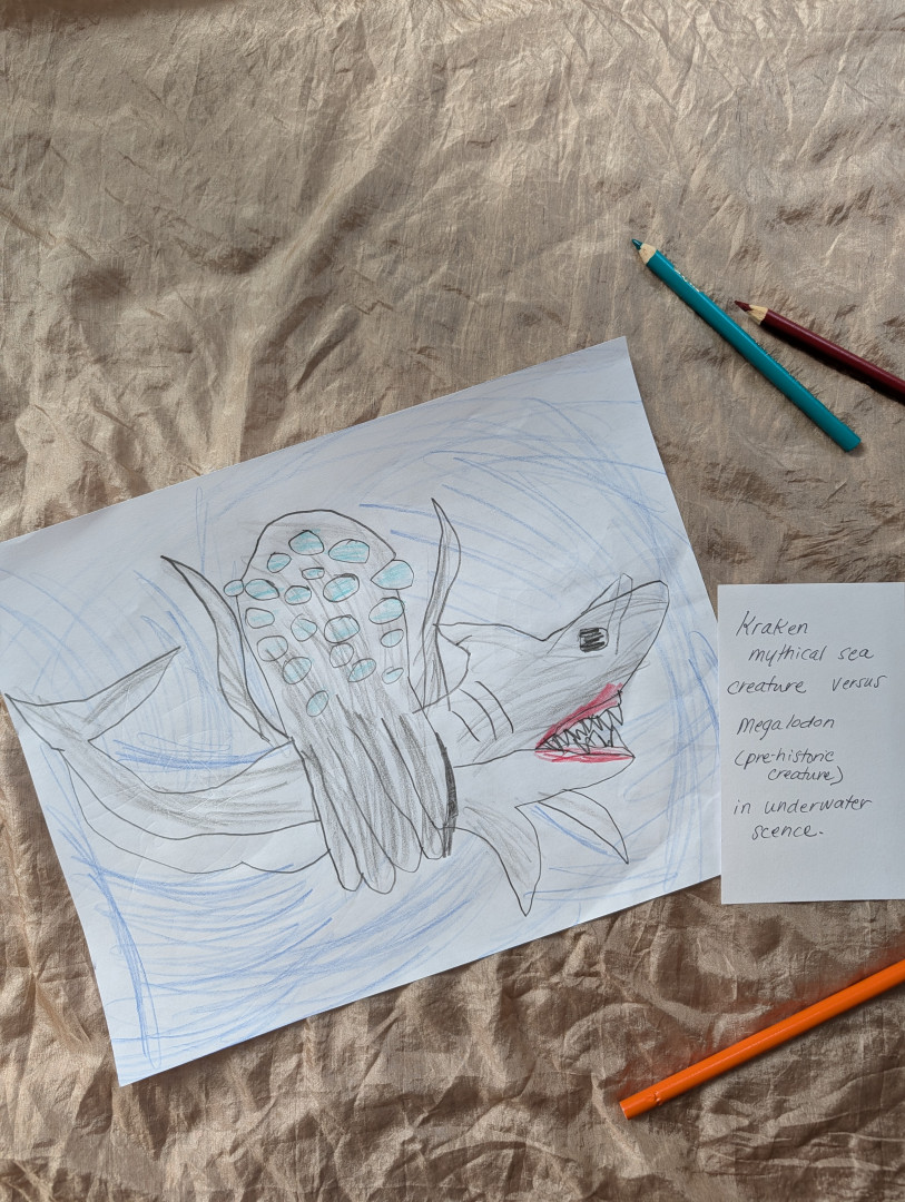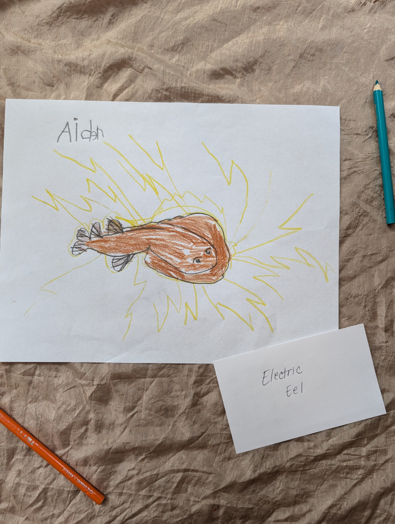 Aiden (6) draws many pieces a day. Anything that interests him he recreates on paper! He's kind hearted & and his work lights up our home.