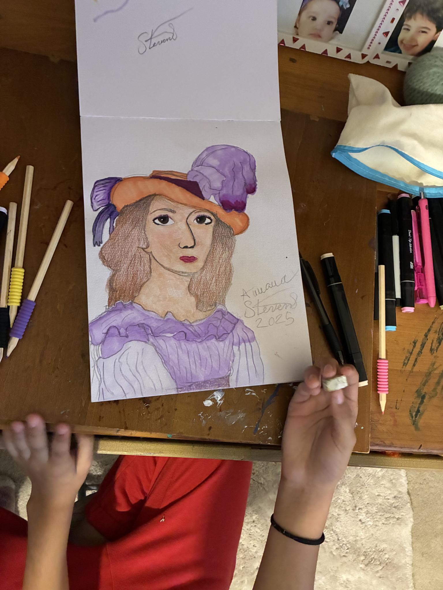Aurora loves to draw faces and loves to draw characters, she starts with a pencil and when she likes what she sees she will either leave it as is or she will color it.