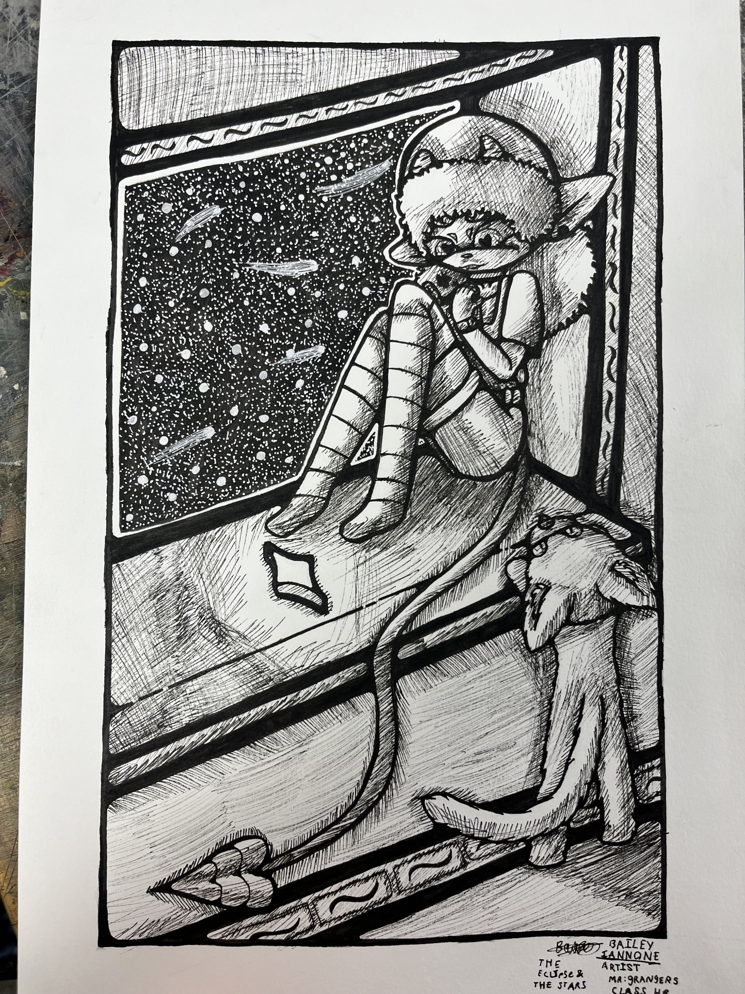 This artwork she drew for her drawing class. It features a girl and her cat, demonstrating her love for reading. This was drawn using ink on watercolor paper, and took about 6 hours to draw.