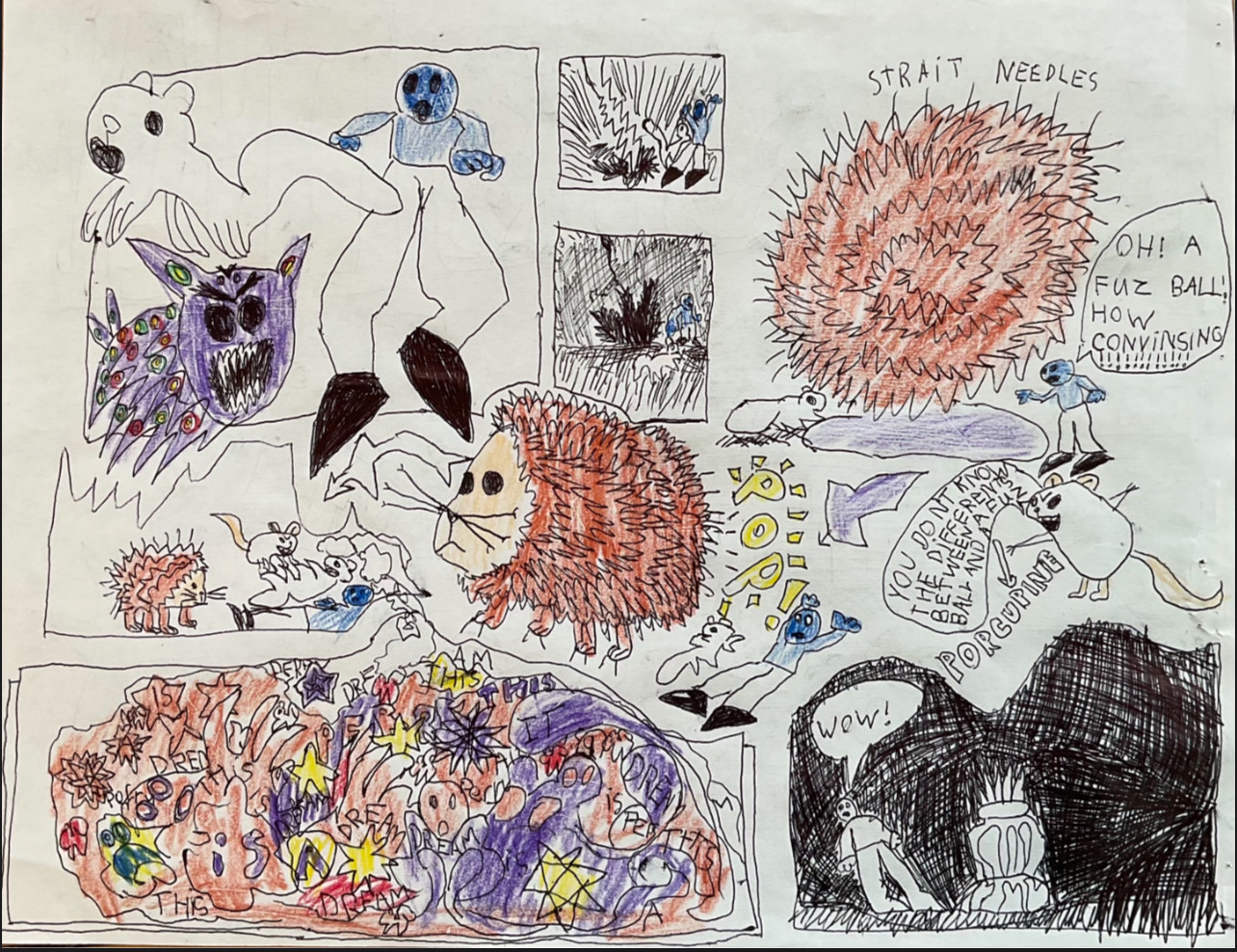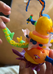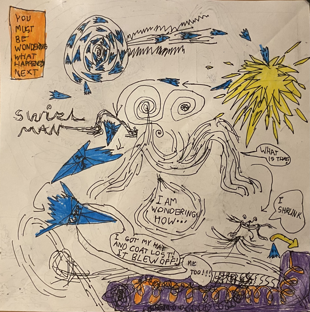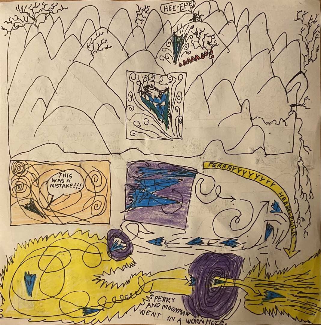 Learn MoreDesmond’s subject matter spans from outer space, to animals, to nature, cities, buildings, made up characters. His imagination knows no boundaries. He makes creative drawings, he sculpts out of clay, wax, pipe cleaners, he can make something out of any material. Lately he has loved making stop motion animations, he builds his own sets and creates his own characters and stories. He utilizes his skills… comics, sculpting, drawing, painting, animating all come together to make up his universe.