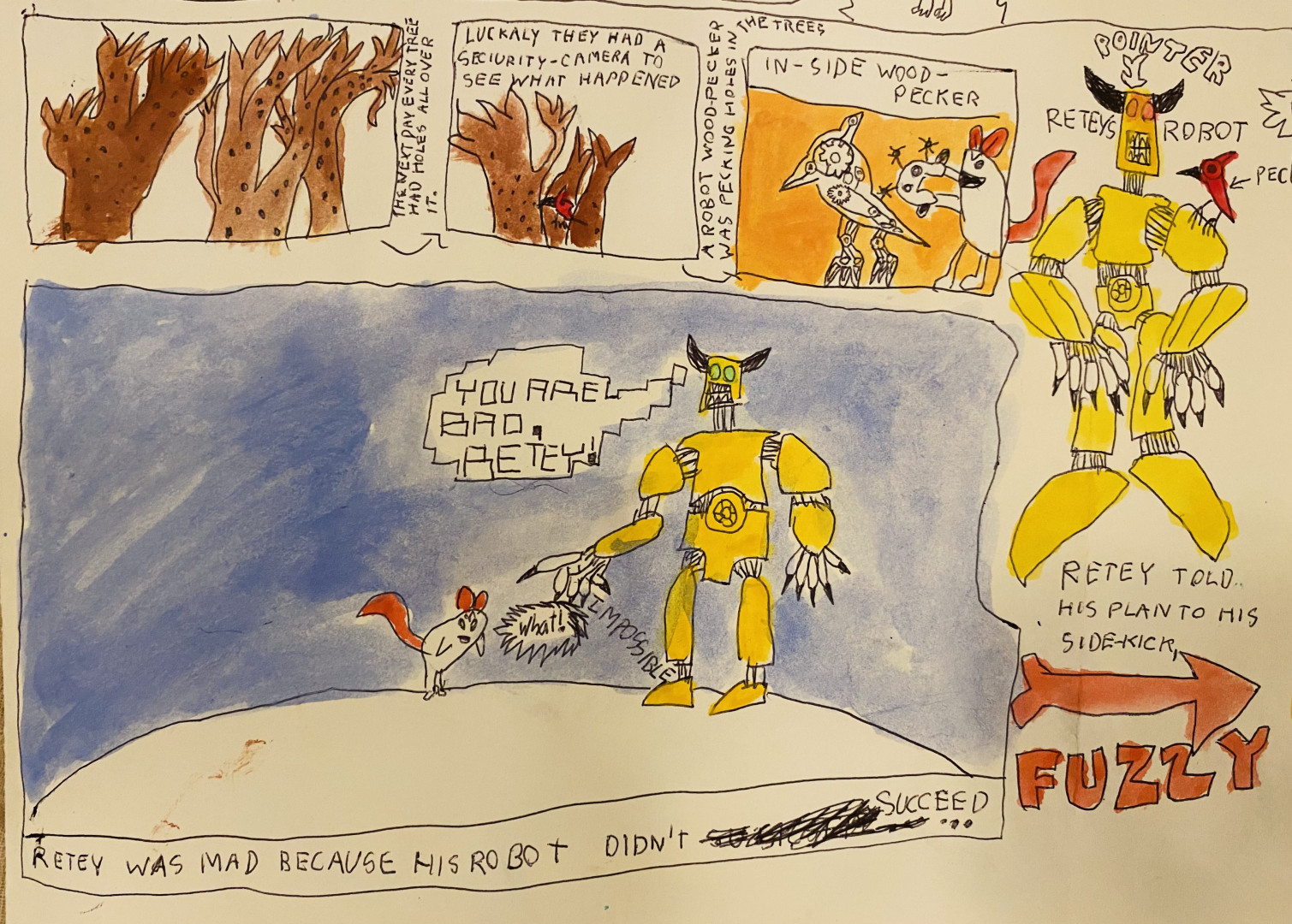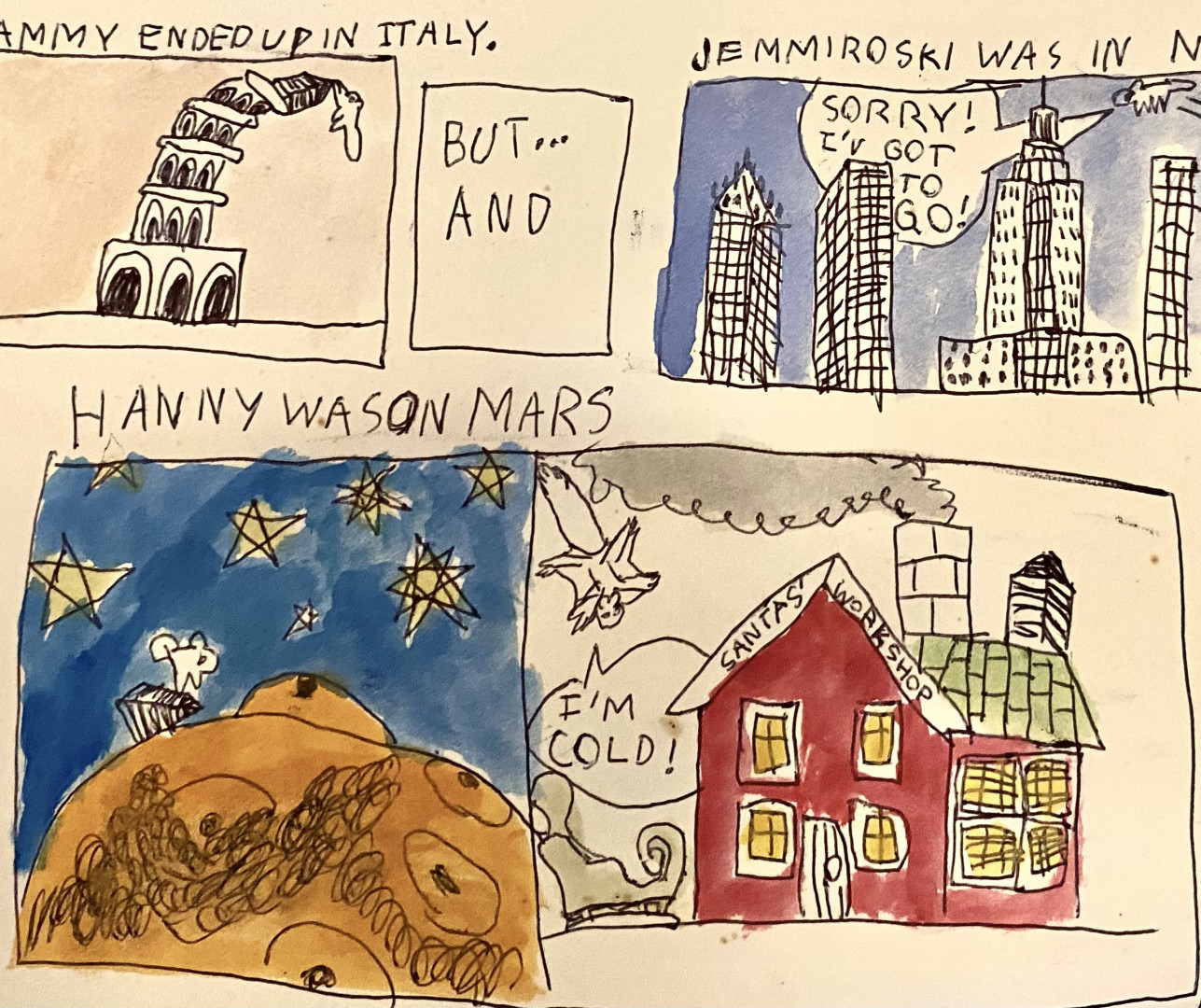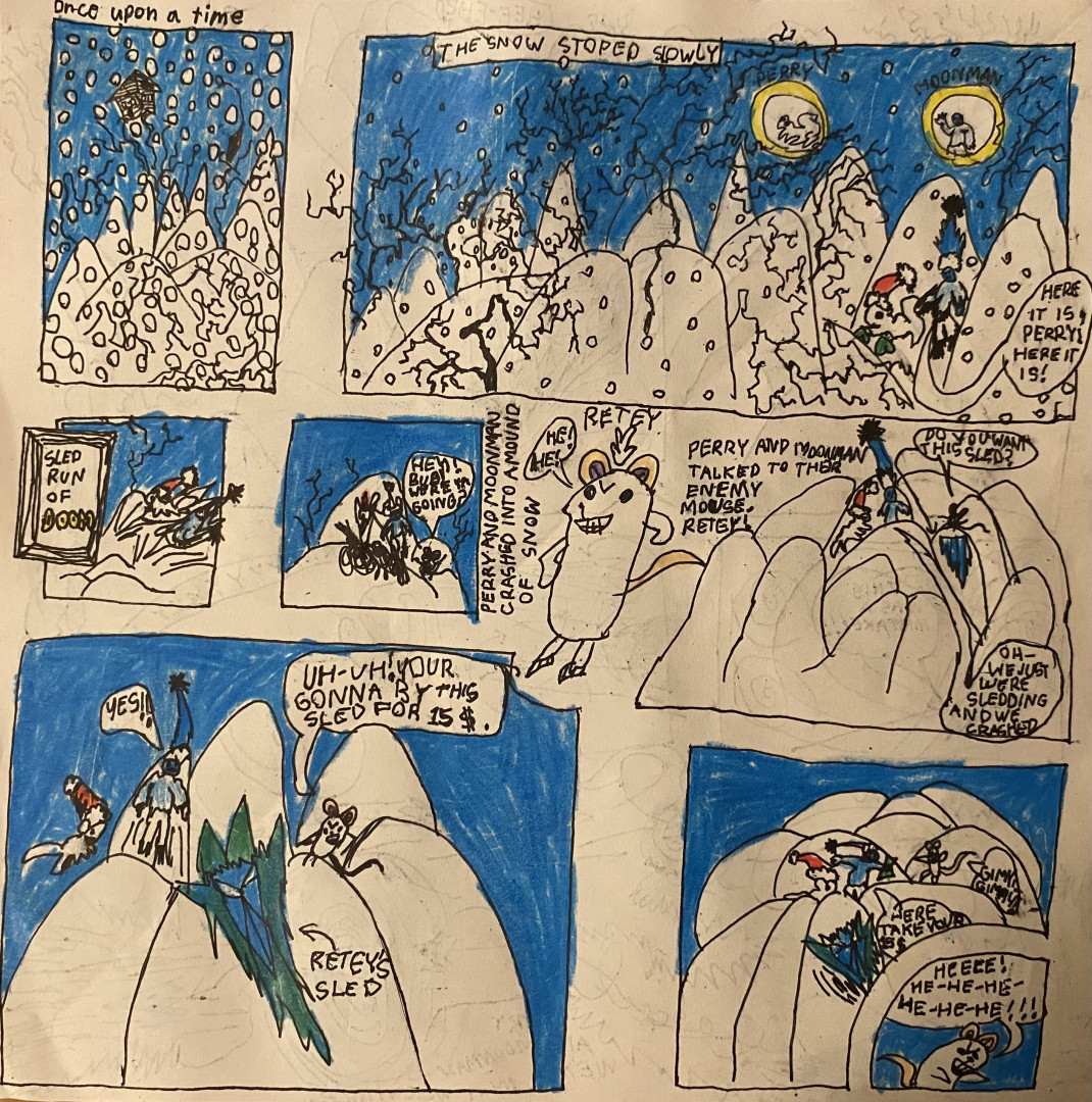 Learn MoreDesmond’s subject matter spans from outer space, to animals, to nature, cities, buildings, made up characters. His imagination knows no boundaries. He makes creative drawings, he sculpts out of clay, wax, pipe cleaners, he can make something out of any material. Lately he has loved making stop motion animations, he builds his own sets and creates his own characters and stories. He utilizes his skills… comics, sculpting, drawing, painting, animating all come together to make up his universe.
