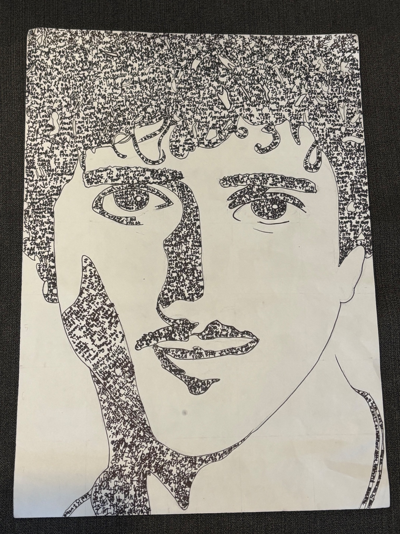 Learn MoreThis portrait shows Jack’s ability to think beyond traditional art. Using a grid for accuracy, he recreated Benson Boone’s face with careful attention to detail, demonstrating focus and strong technical skill. What makes this portrait truly unique, is how Jack chose to fill it. Instead of shading with pencil alone, he used handwritten song lyrics to create the shadows and contours of the face. By blending visual art with music, Jack turned a traditional portrait into much more creative.