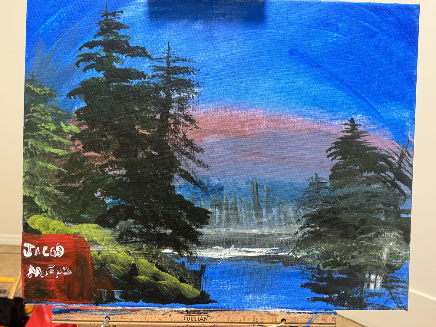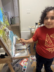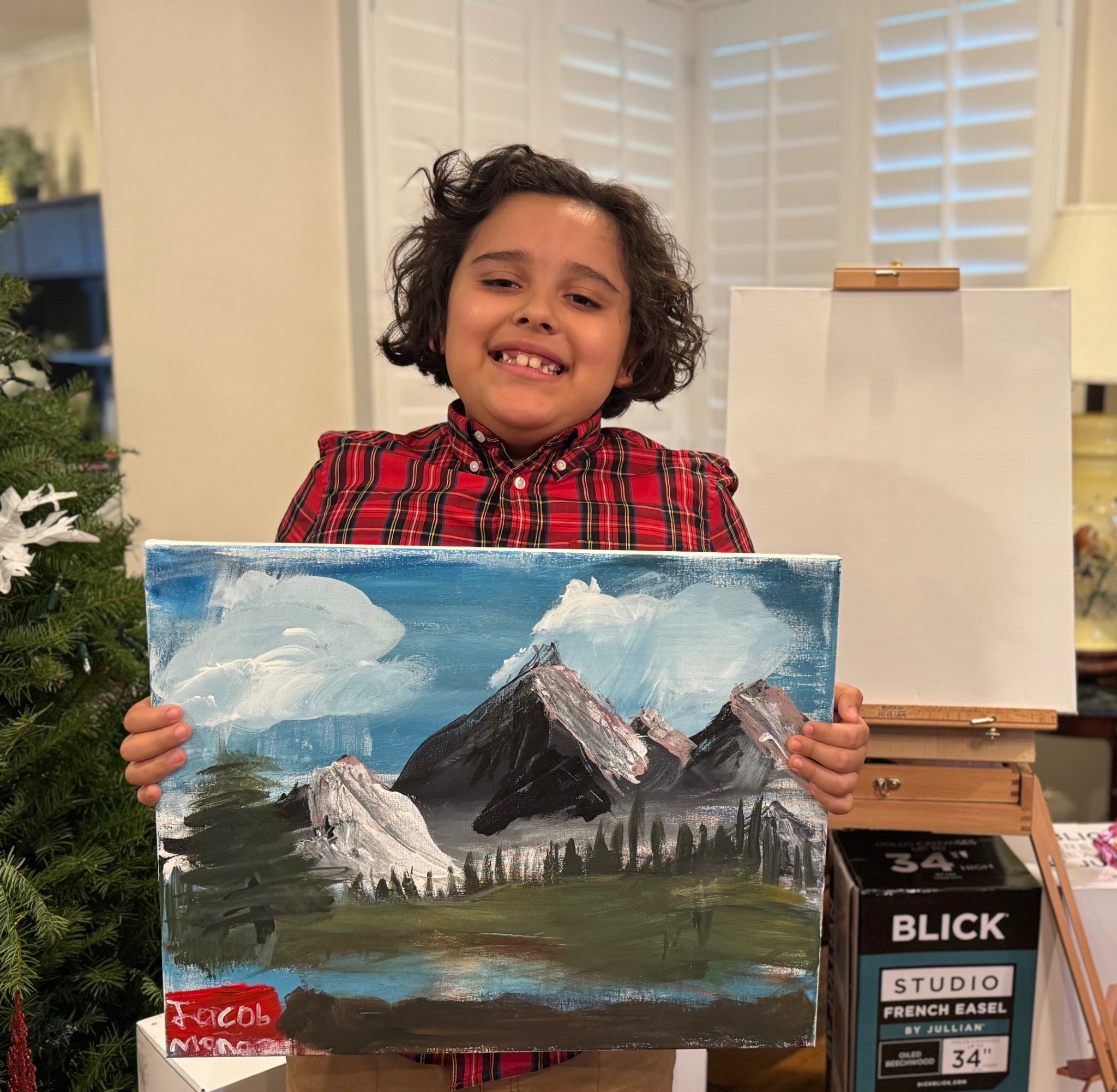 Who or what inspires Jacob to create?Jacob Muñoz was inspired to paint while watching Bob Ross’s The Joy of Painting after being displaced from his home during the Eaton Fire. While staying at his grandparents’ house, he spent evenings watching television with antenna ears, listening to Bob Ross’s calm, steady voice. The show brought comfort during a difficult time and helped him fall asleep at night. What started as comfort turned into curiosity, then passion. Painting became a way for Jacob to feel calm, grounded, and safe.