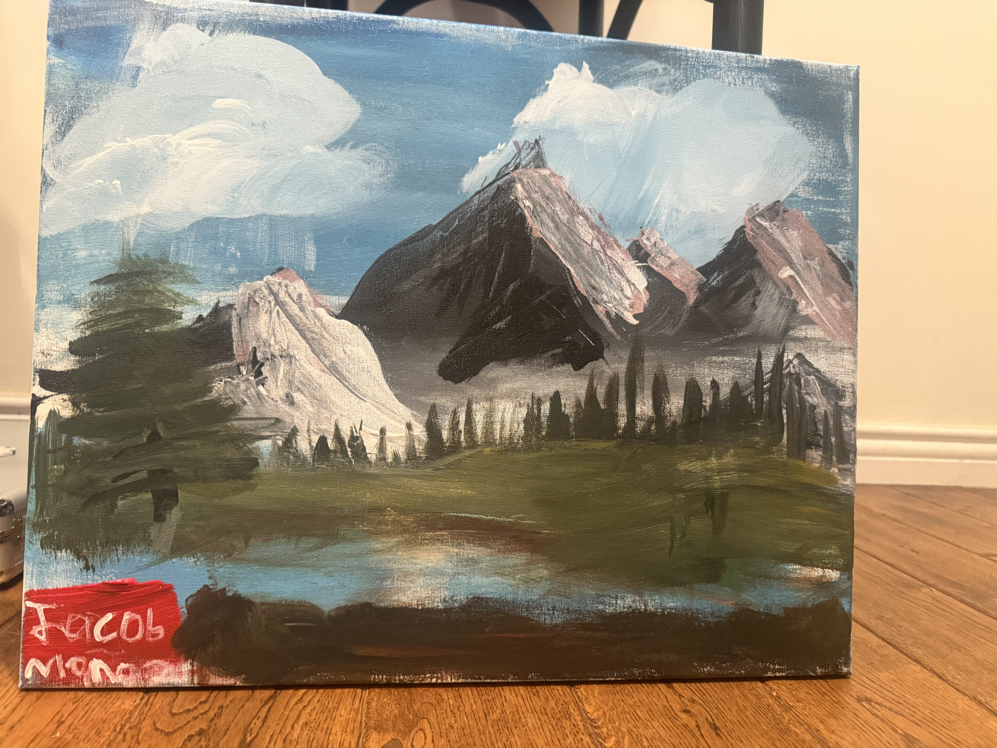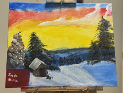 What is Jacob's favorite art form?Jacob’s favorite art form is landscape painting. He enjoys using special brushes and a paint knife, inspired by Bob Ross. His landscapes give him space to express himself creatively, and each piece carries feeling and quiet meaning.