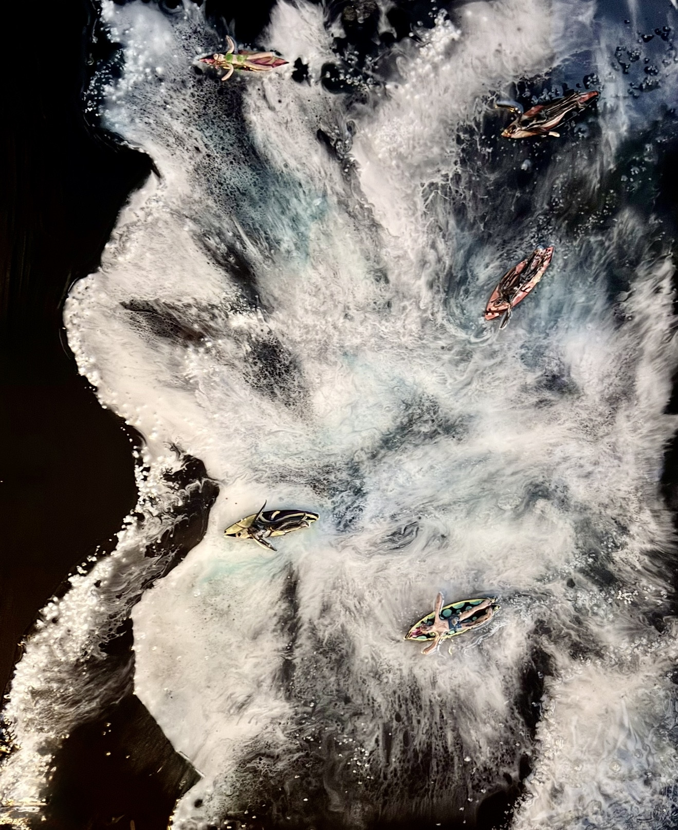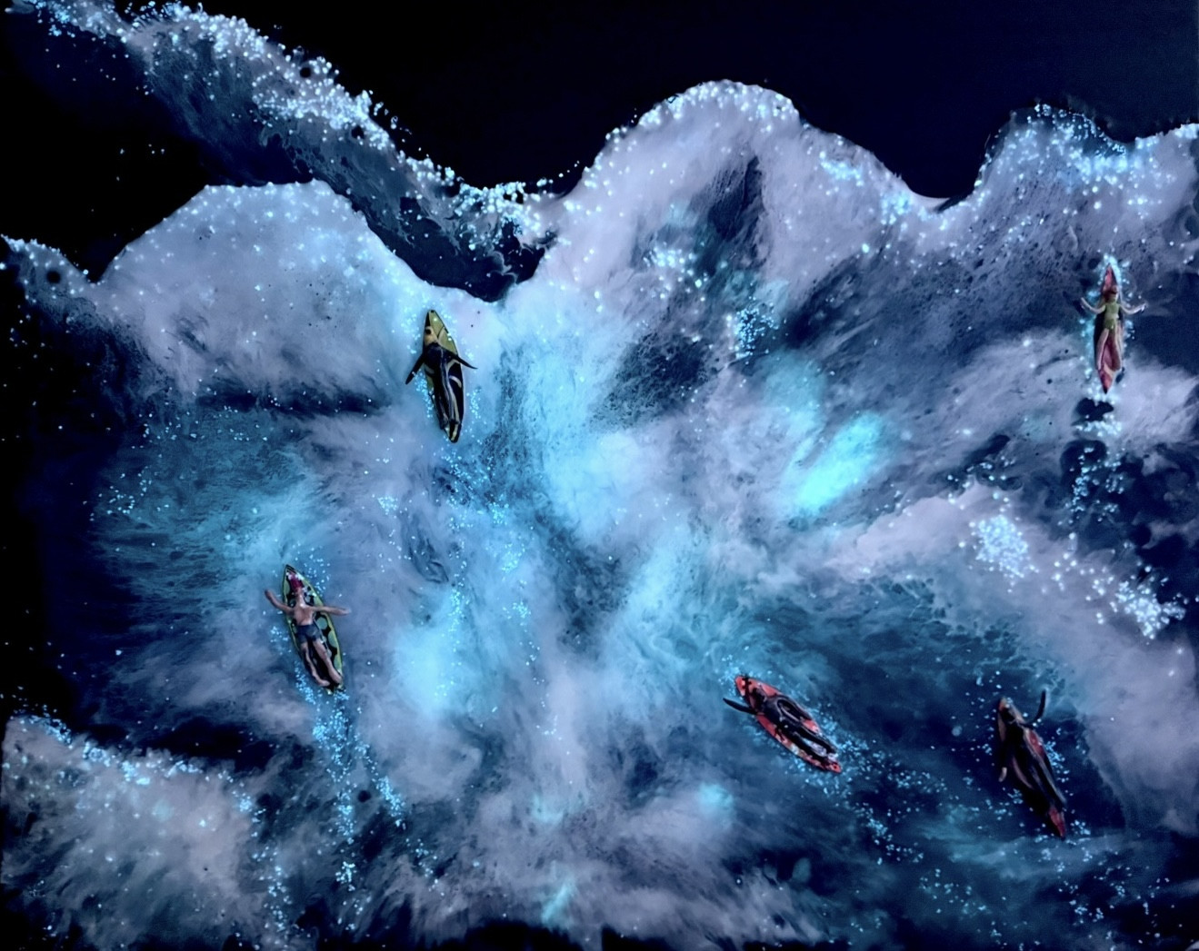 Leila Bahtijaragic’s artwork is inspired by her love for the ocean and the wonder of bioluminescence. Every weekend, she goes to the beach for volleyball lessons, where she watches surfers ride the waves and imagines the water glowing as they move, with trails of light shining behind them. These moments spark her creativity and shape the stories she brings to life through her art. She uses resin, blue liquid ink, acrylic paint, glow pigments, and UV light to recreate the beauty of the ocean at