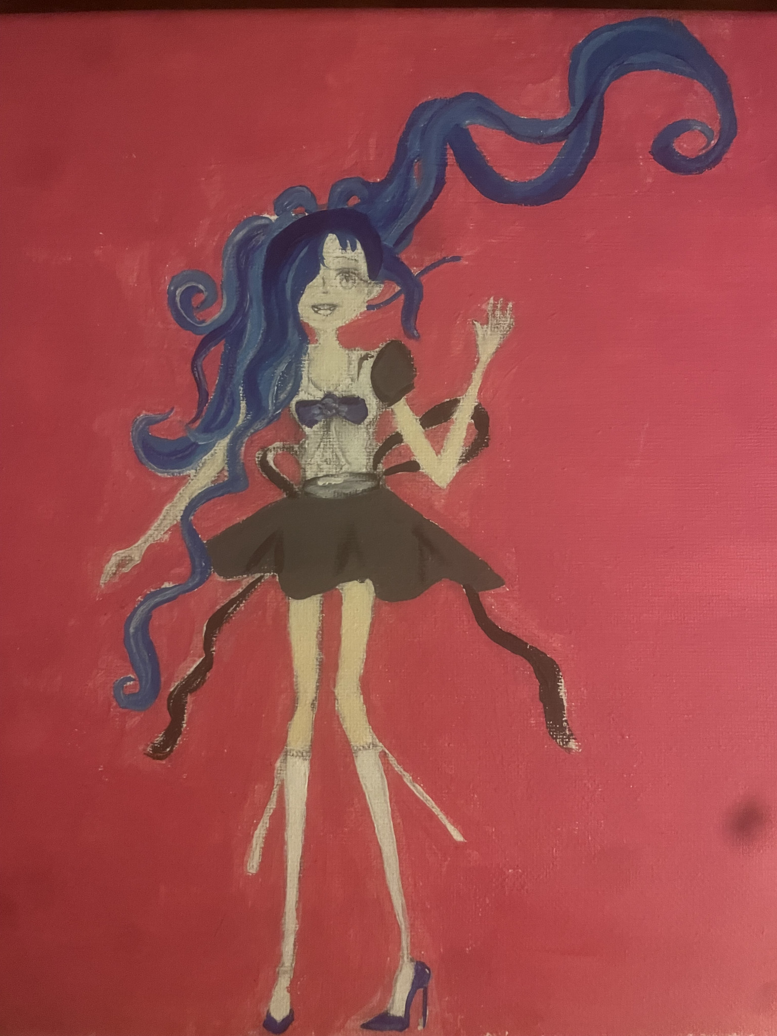 She painted a girl from Japan wearing a school uniform. She said: “she has blue hair because I like blue and it makes her look cool and special. The background is pink because pink is happy and makes the picture feel nice. I wanted my painting to look fun and pretty”.