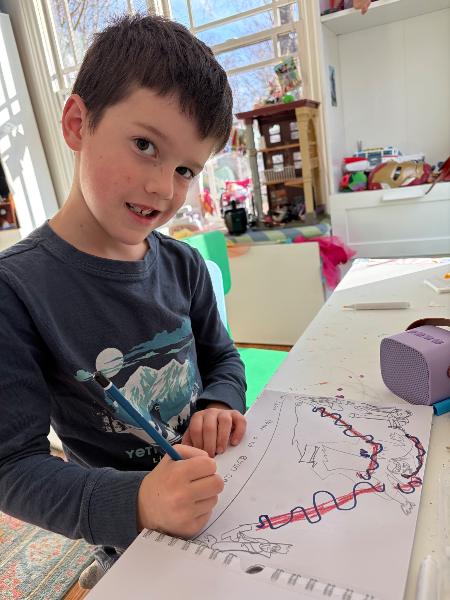 Luca spends most of his free time at his desk drawing with pencil. If something scares him, he draws it!