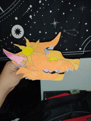 What is Lyra's favorite art form?painting is currently her favorite art form. She goes through periods though. She also loves crafting, music, beadwork and embroidery. To change things up she made a paper hand dragon out of macaroni boxes.