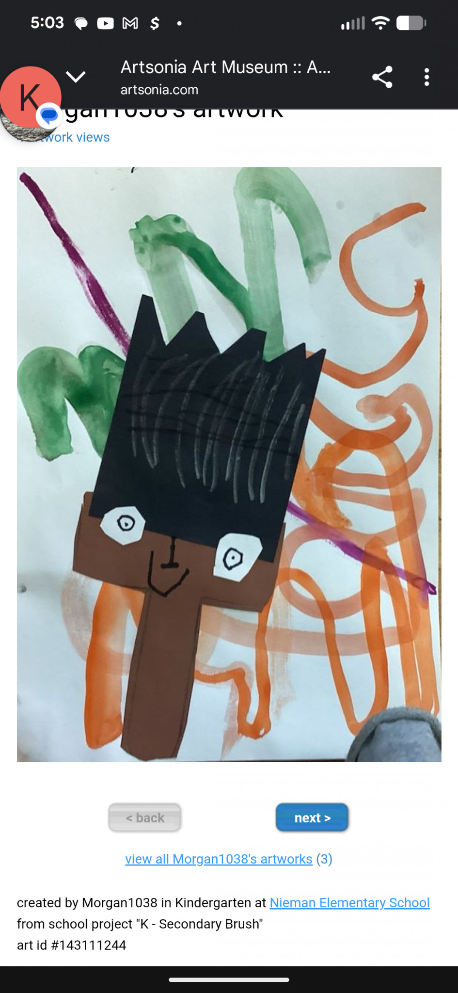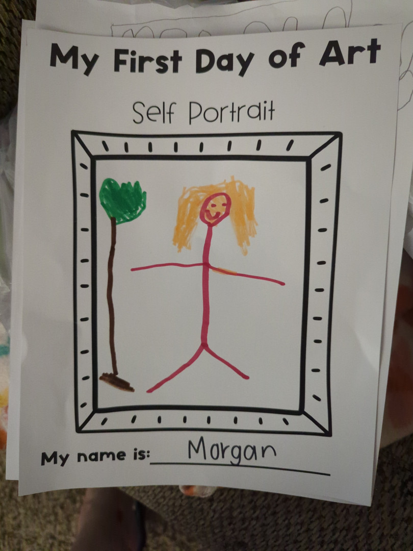 At kindergarten, during Art class, Morgan created this paintbrush person. Not only is the person the art, but it shows how the art lives through him. His creativity is coming through every hair in his paintbrush head. It's a beautiful work of art with excellent contrast and visual enjoyment.