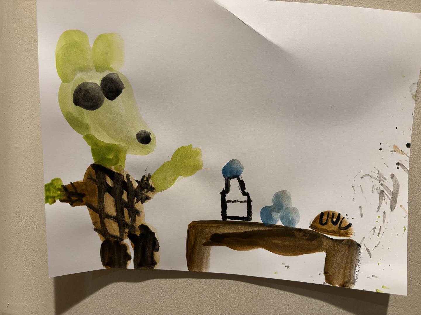 She has used lots of different materials: pencil, pen, marker, paint (watercolor + acrylic) on paper/canvas. She has used different types of modeling clay and recycle/natural materials to build sculptures and “worlds” for certain inanimate objects. Her art is “loose” which is very consistent with a precocious and creative first grade child filled with whimsy, character and humor. Nothing is too precious or exact, she is flexible and when something doesn’t work out or breaks she problem solves.