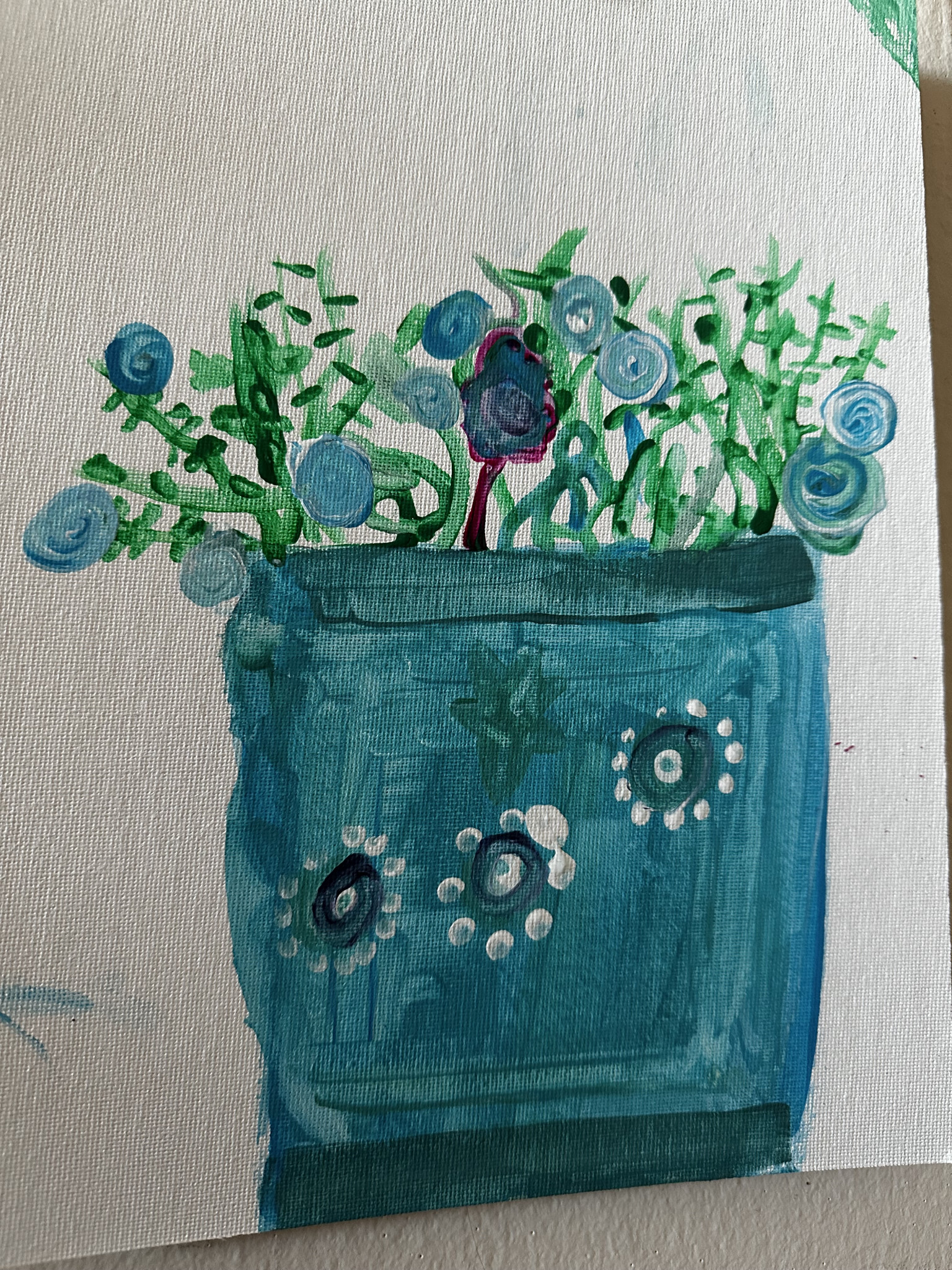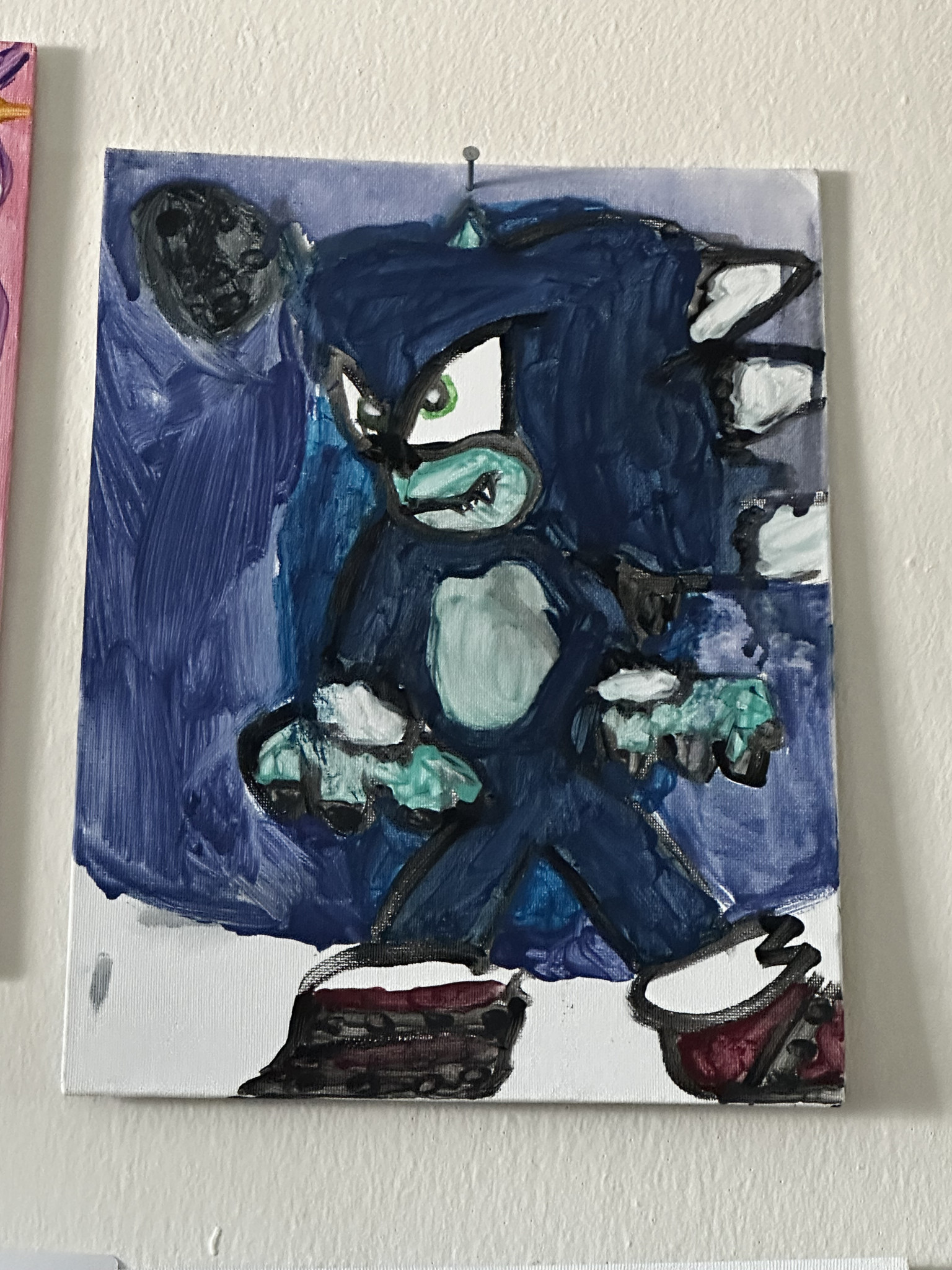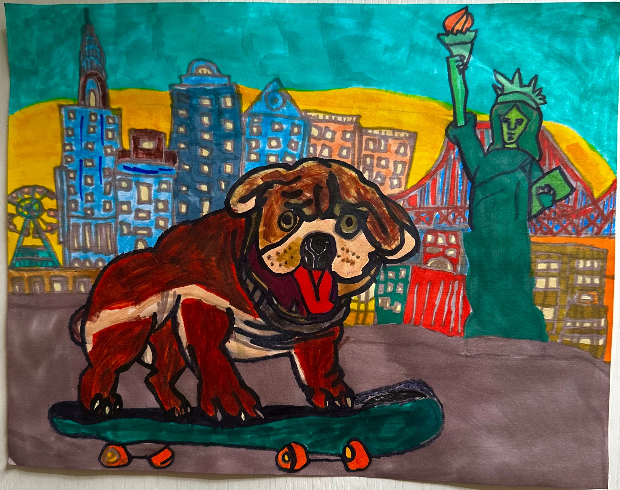 The piece celebrates freedom, movement, and joy a dog skateboarding through an iconic city is a powerful image of playfulness and independence. It suggests leans into imagination, humor, and bold visual storytelling, unafraid of color or personality. The flower pot is bold and forceful, this one is quiet, tender, and observant. A strong pull toward iconic figures in Sonic and familiar forms, reimagined through personal expression.