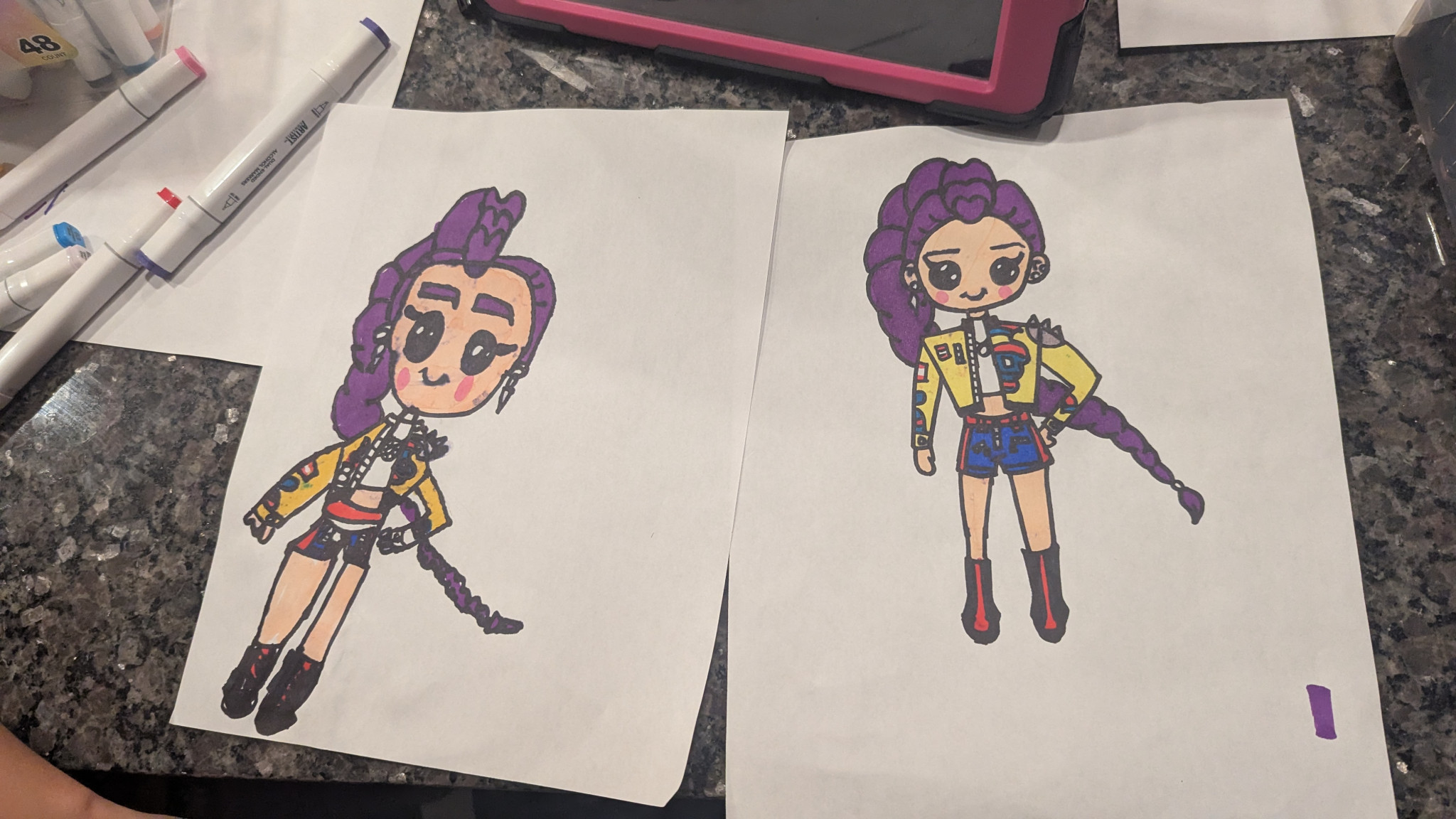 What is Sophia's favorite art form?Sophia’s favorite art form is mixed media illustration, primarily using a combination of markers, crayons, and colored pencils. She loves the bold, vibrant lines she can achieve with markers to define her characters, paired with the soft textures of crayons and pencils for shading and detail. This 'no-rules' approach to materials allows her to experiment freely and ensures that every piece is as dynamic and colorful as the worlds in her imagination.