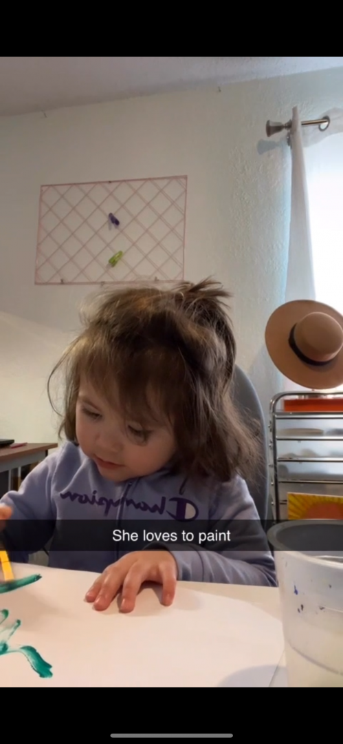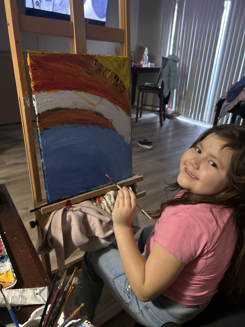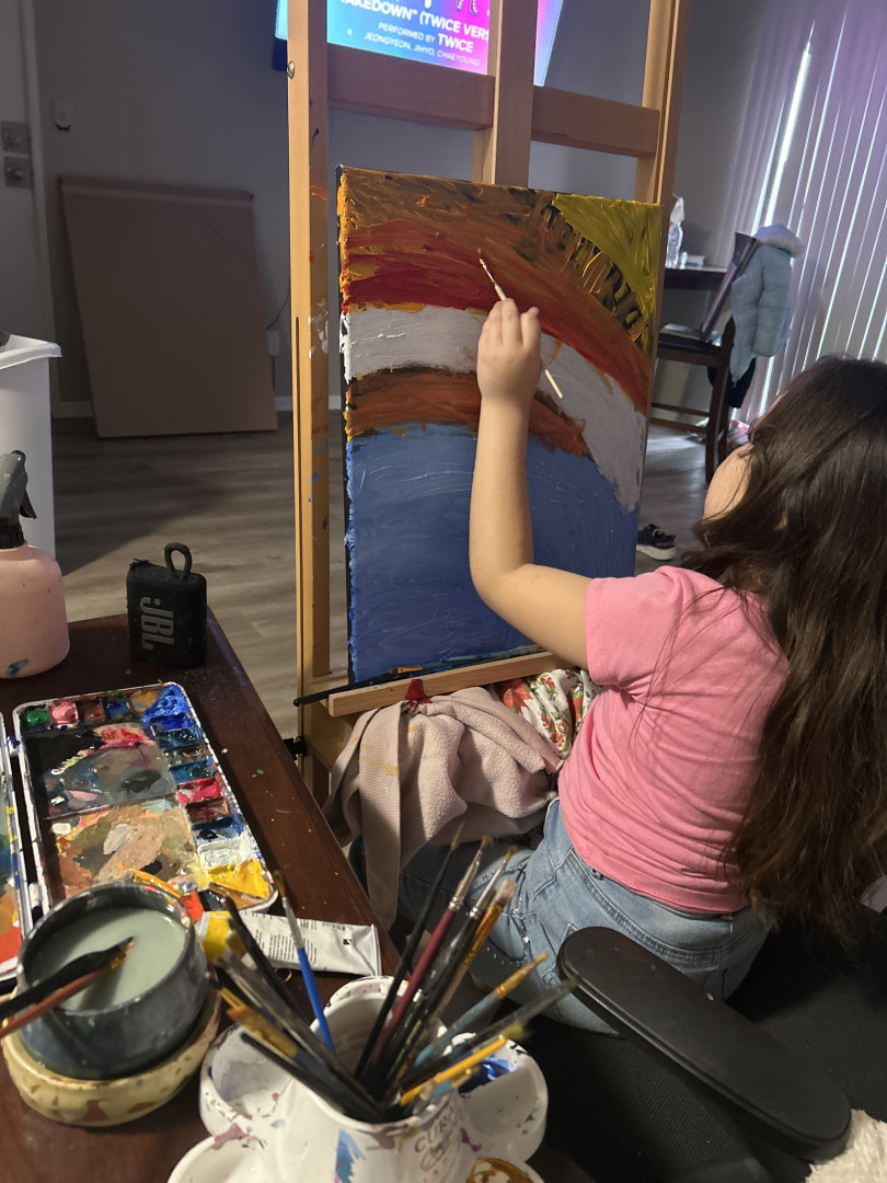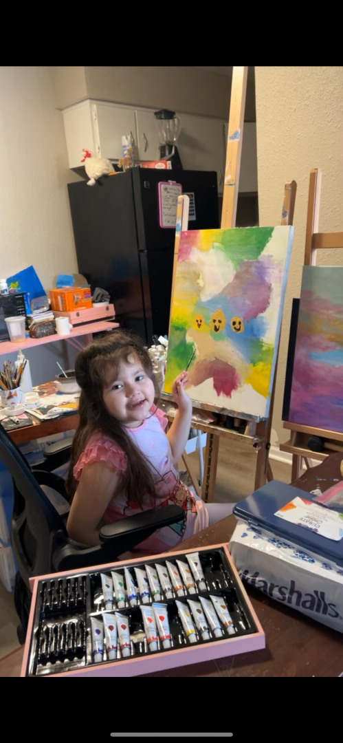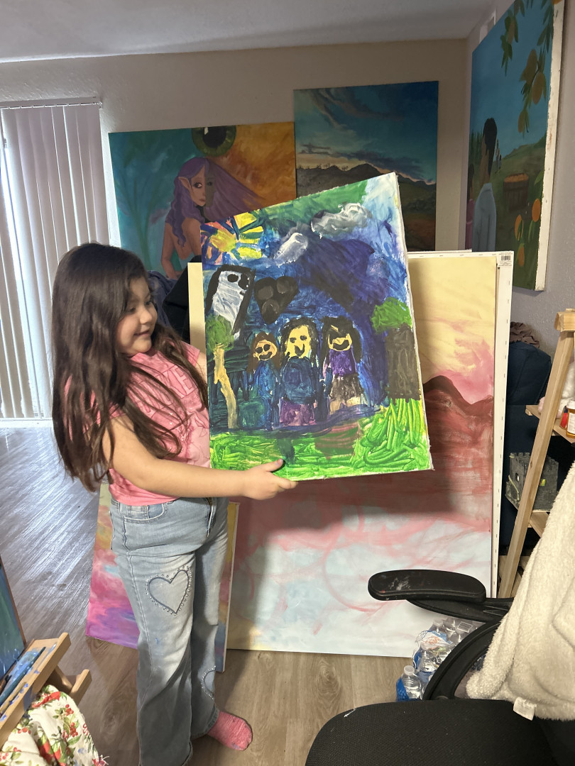 My niece is always painting she explores consistent themes of family and home. she’s painted since being able to hold a paint brush.
