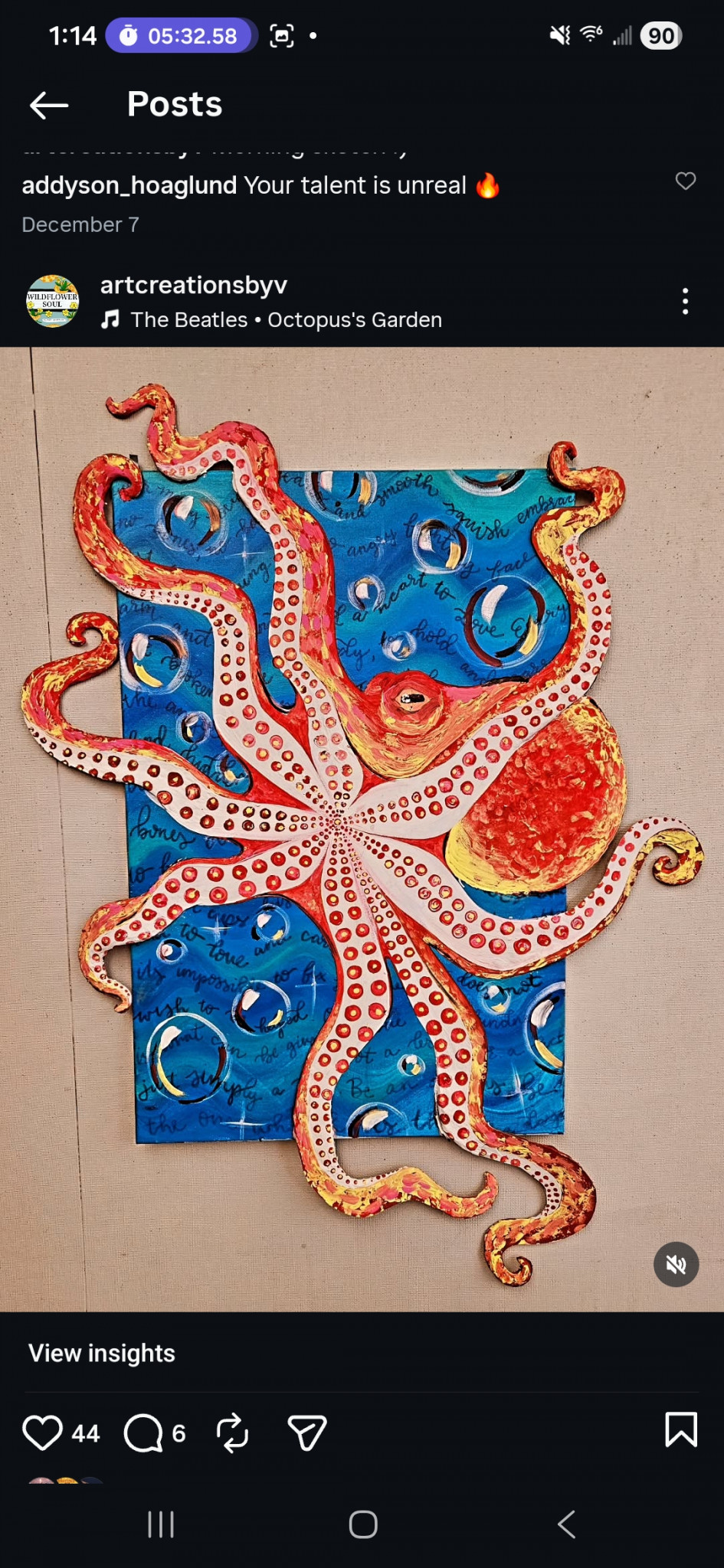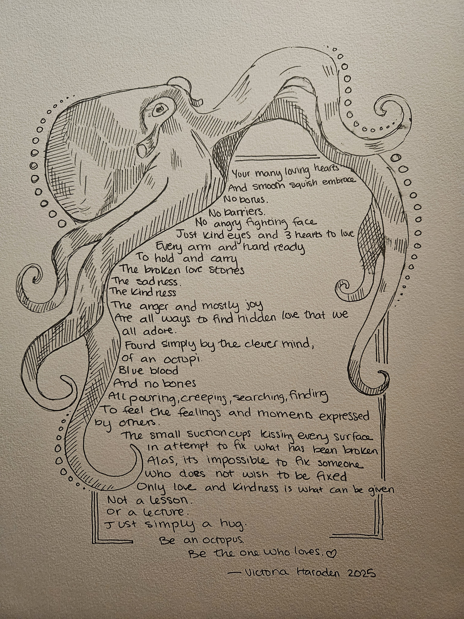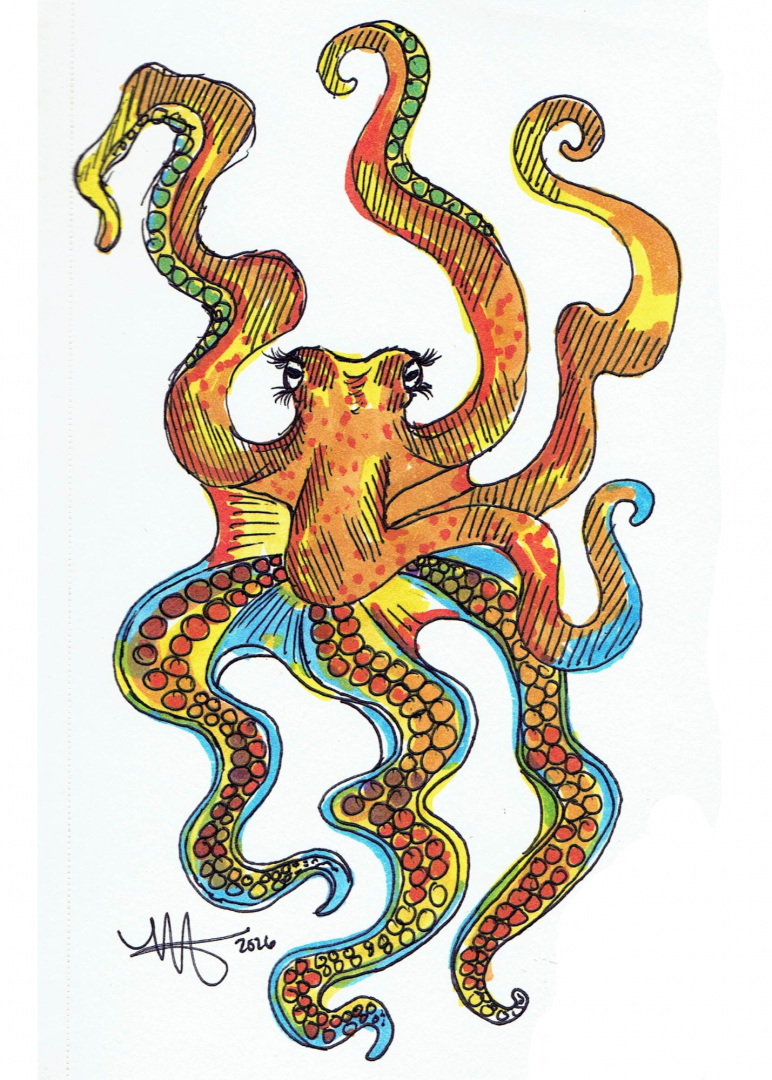 Who or what inspires Victoria to create?Victoria is inspired by human nature and the love and kindness that can be seen in people's hearts through their actions. She is inspired by all nature, but more specifically octopuses. She has a deep love and fascination with the octopus species. The way they move, their many hearts, and curiosity, as well as their many colors are what she loves most about them and what inspires her to paint.